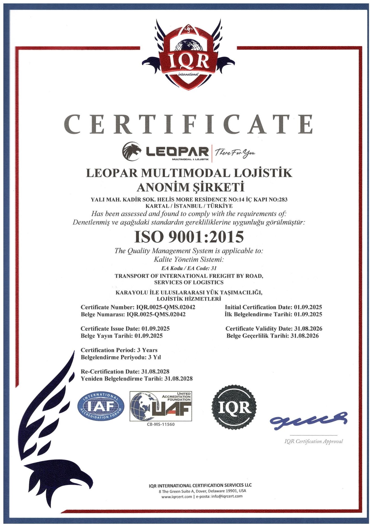 ISO 9001:2015 KALİTE YÖNETİM SİSTEMİ BELGESİ